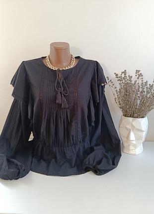 Блуза свободного кроя. Хорошая прошва и объемные рукава. Размер L/XL. 10% бавовна. Тоненькая. Нова 🖍️ПОГ-67 🖍️ПОТ- 46-57 резиночка 🖍️ПЛЕЧІ-36 🖍️ ДОВЖИНА -57 🖍️РУКАВ -62