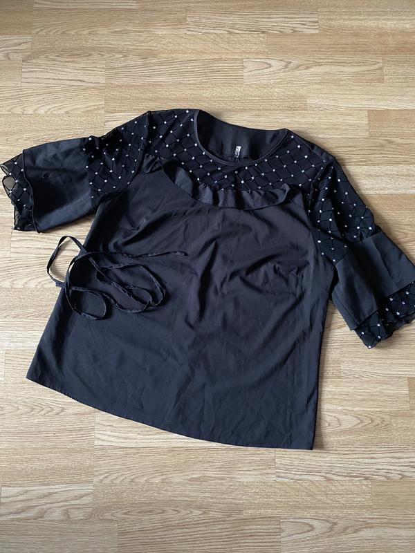 Красива жіноча блуза з четвертним рукавом,в ідеальному стані,зі стразами та сіточкою,є шнурочок яким можна підвʼязати на талії