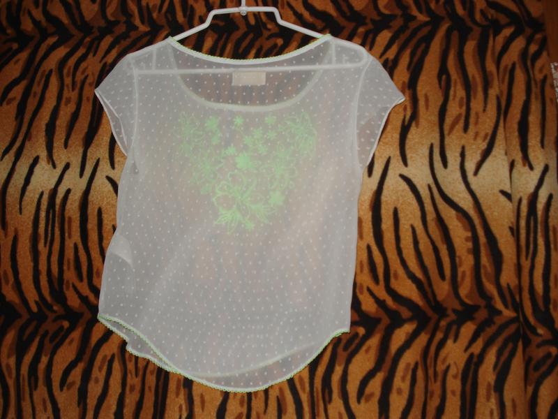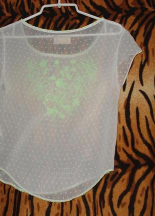Шикарная,фирменная,стильная ,полупрозрачная,белого цвета в пупырышки блуза,впереди на груди чудная вышивка салатовыми нитями,вырез обверлочен салатовыми нитями,низ обверлочен салатовыми нитями,слева внизу впереди эмблема фирмы-вишневого цвета птичка,объем груди-88см.,длина-52см.