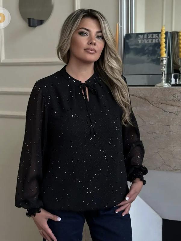 Стан идеален. Ткань - полупрозрачный черный шифон с серебристыми капельками, на подкладке.В рукавах подкладки нет.Очень красиво смотрится, фотографии не положили ее красотке.питую капельки выглядят как стразы.Низ блузы и рукавов на резинке. Длина -74 ПОГ-62 ПОБ-64 Длина рукава от горловины -71