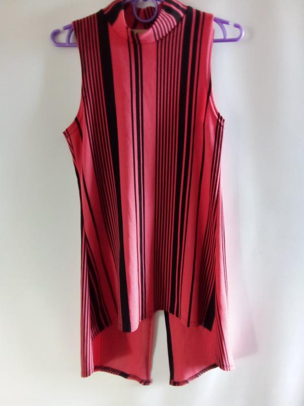Блуза, красивый коралловый цвет в черную полосу, сзади разрез, есть застёжка -крючок. Смотрится шикарно!