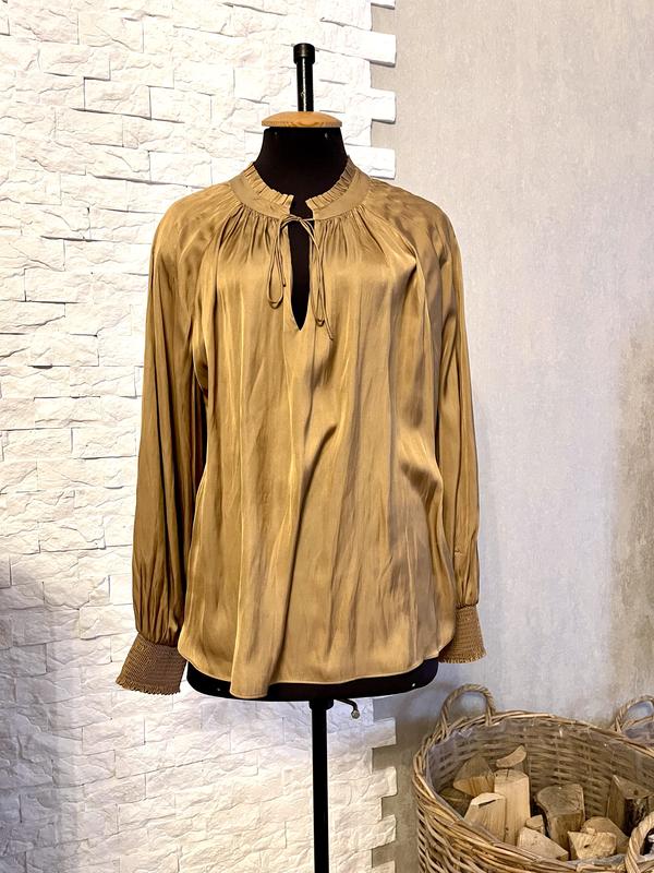 Женская классическая блузка. Блузка от известного бренда Massimo Dutti Блузка выполнена из шелковистой ткани золотисто-коричневого цвета. Блузка имеет длинные рукава с манжетами на резинке, воротник круглый вырез, который завязывается на тонкие шнурки. Блузка имеет свободный крой и слегка драпированная.
