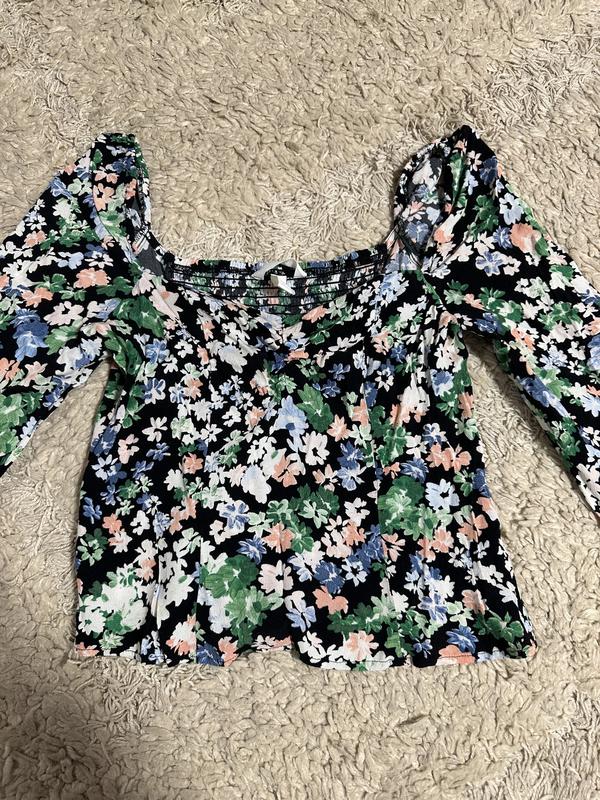 Милая блуза в цветочный принт, натуральная ткань, спереди красивый вырез, сзади идет на резинке, подойдет под пузырьок, размер с-м, замеры скина в кроватку!
