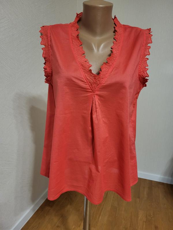 Отличная блузка для лета, очень легкая, цвет очень приятный, что-то среднее между коралловым и красным ПОГ 50, длина 64