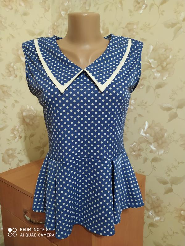 Стильна блуза в горошок синього кольору Пог.42,6см,талія 36,5см,довжина58,3см.