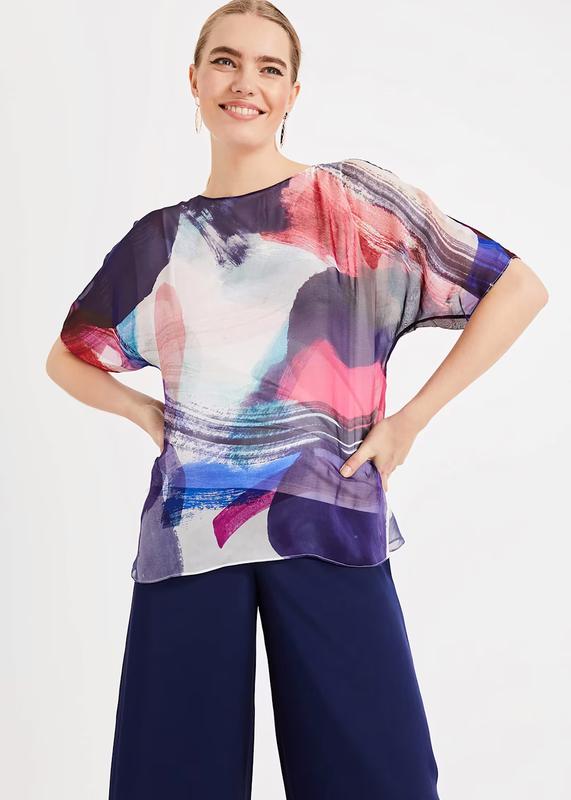 Блуза в идеальном состоянии. Модель Serefina Silk Blouse из актуальной коллекции, доступная на оф сайте. Ткань - очень тонкий прозрачный шелк воздушного плетения, с ярким абстрактным принтом, нить с лоском, к краю ворота пришита облегающая эластичная майка сливочного цвета (130 грамм). Свободный крой «летучая мышь», круглый вырез с застежкой сзади, по бокам разрезы. На оф сайте эта модель стоит 135€ Состав: 100% шелк; топ: 94% вискоза, 6% эластан Мерки (указан UK12): ворот по плечам 25 см рукав от ворота 38 см ПОТ 50 см длина 70 см топ: плечи 36 см ПОГ 46 см ПОТ 42 см низ 48 см длина 63 см С 1979 года компания Phase Eight движима целью создания красивой женственной одежды для тех, кто любит элегантный стиль и качественный пошив. Приобретая одежду, обувь и аксессуары Phase Eight Вы получите модные, но неподвластные времени вещи, которые останутся в Вашем гардеробе на долгие годы.