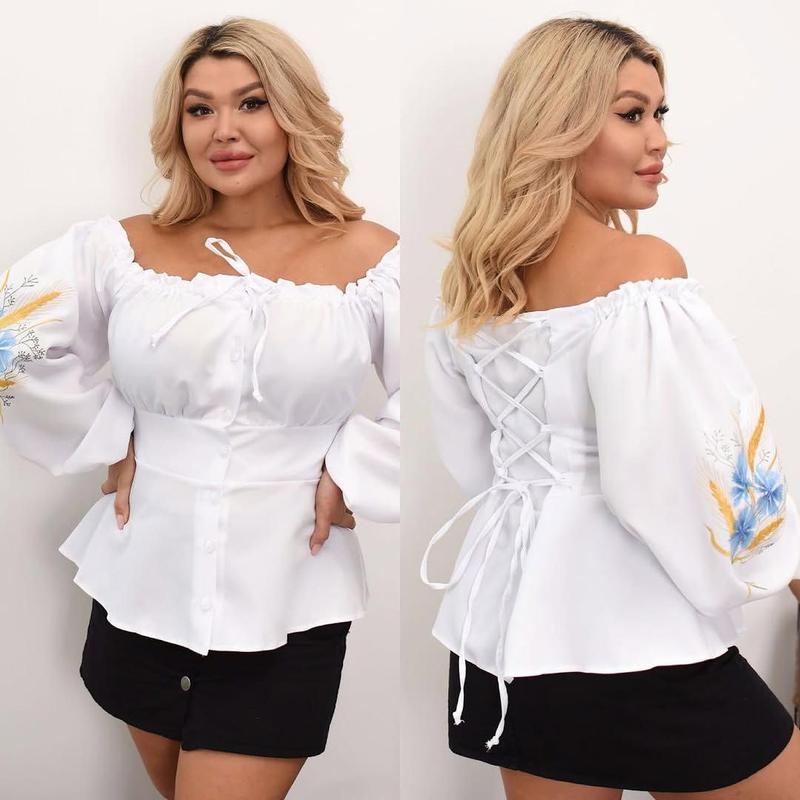 Блуза с вышивкой Арт 2103255 мод 077 Pозмipы: 48-50,52-54,56-58,60-62 Тканина: тонка костюмка Блуза на пуговицах, спинка регулируется шнуровкой ВЫМЕРЫ: 48-50: ОГ - до 112 см; Длина спереди - 52 см; Длина рукава - 60 см; 52-54: ОГ - до 120 см; Длина спереди - 53 см; Длина рукава - 62 см; 56-58: ОГ - до 130 см; Длина спереди - 54 см; Длина рукава - 64 см; 60-62: ОГ - до 140 см; Длина спереди - 56 см; Длина рукава - 66