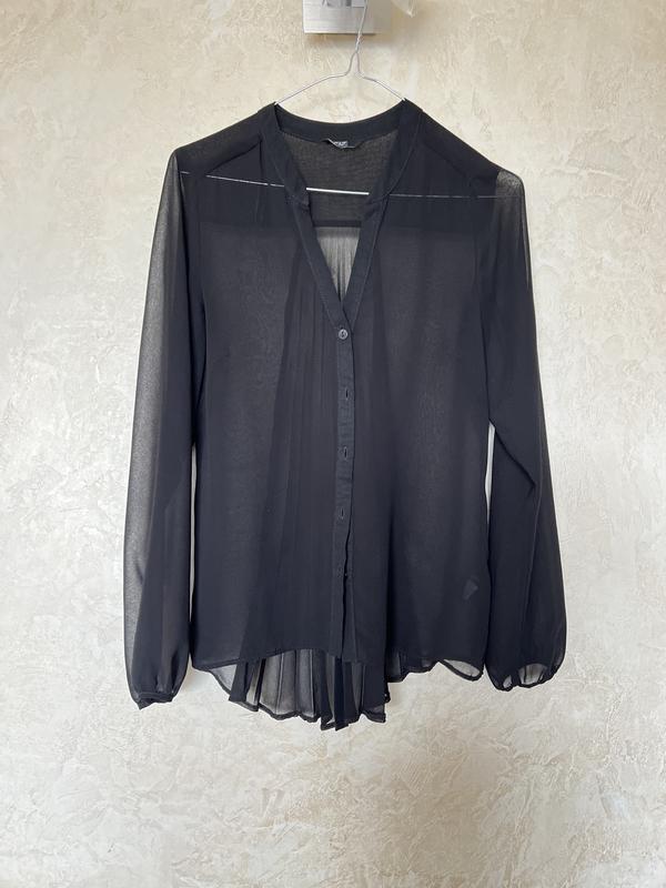 Блуза чорна , прозора , пошиття розширене до низу ззаді вставка плісірований клин .
