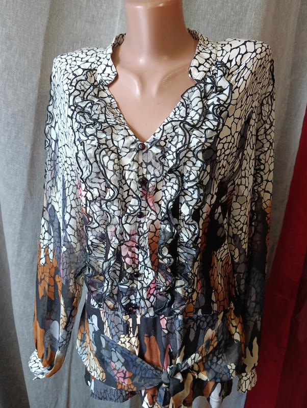 Блуза не просвечивается, рукав просвечивается, внизу декоративный пояс длина 64/67 ног 45 нот 43 но низу 49 длина рукава от плеча 59 немного тянется, приятная к телу, впереди декоративные пуговицы и рюши. , на рукавах тоже маленькая рюша. Воротник маленька стойка.