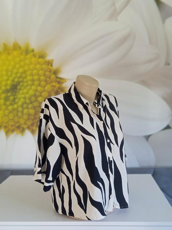 Стильная блузочка с коротким рукавом и оригинальным контрастным рисунком. Интересно сочетаются цвета. Легкая и удобная. Приятная на ощупь. Вискоза. Практически не тянется. На гудзичках. Укорочена. Ложится свободно -оверсайз. Есть размеры.
