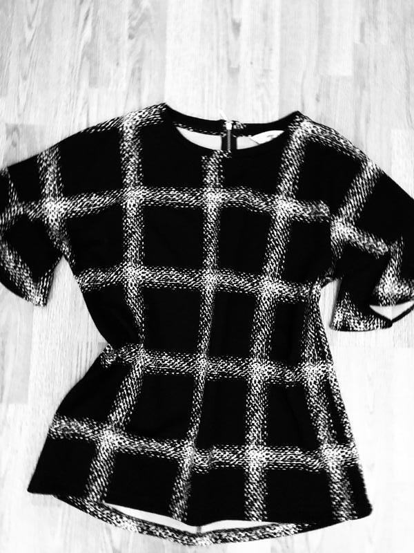 Блуза цвет чёрный с белым, рукава с оборочками , сзади змейка. Состояние новой. Длина изделия 68 см, рукав от ворота 38 см, ПОГ 58 см, ПОТ 56 см, ПОБ 56 см, все замеры не в натяжку, тянется