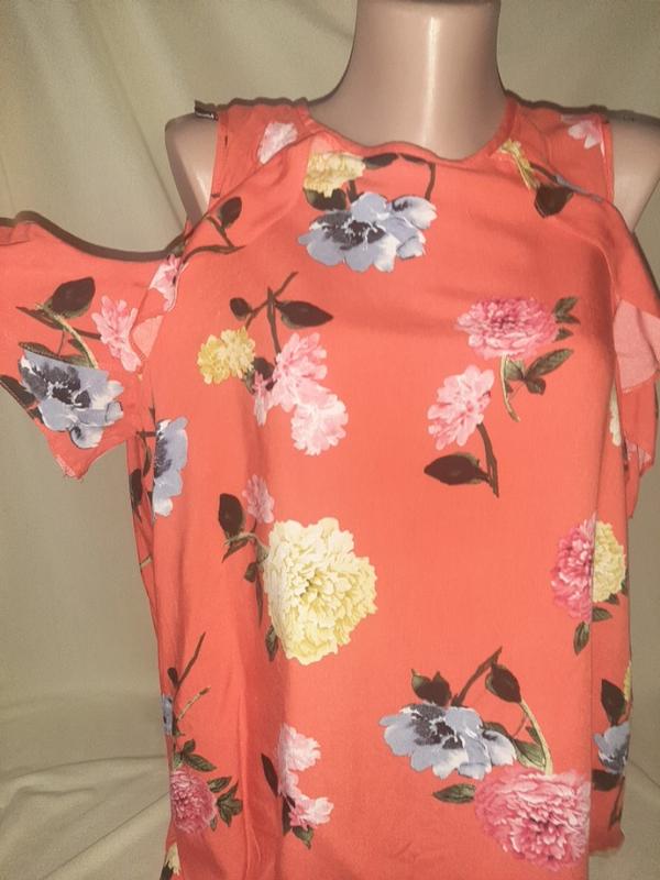 Блуза в цветах с открытыми плечами, состояние новой, состав 100% вискоза, размер указаемый UK 14 : ПОТ - 52см, ПОБ - 62см, длина - 63см
