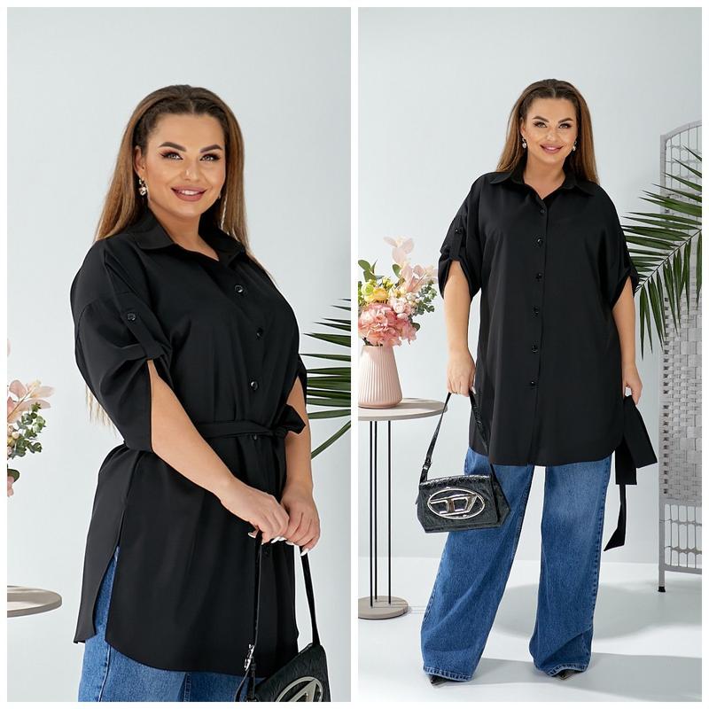 Блуза НОВИНКА💥💥💥 В НАЯВНОСТІ✅✅✅ Код 3774 Тканина: софт. Цвет: черный, ярко-синий, белый, темно-зеленый, мокко. Размеры универсальные: (52-58); (60-66). Длина блузы: 92, 96. Длина рукава от горловины: 64, 66 см. Обхват рукава: 56, 60. Замеры готового изделия: 52-58 ОГ 126 ОТ 130 ОС 130 60-66 ОГ 142 ОТ 146 ОС 146 На модели размер 52-58❗️❗️❗️ Рост 169 см. ОГ 104 ОТ 80 ОБ 110 см✅ Стильная блуза из софта ( ткань не тянется). Силуэт прямой, свободный, удлиненный. Воротник стояче-отложенный. Блуза закрывается на пуговицы по передней планке. Линия плеча спущена, рукава длиной чуть ниже локтя, можно укорачивать с помощью специальной детали на пуговице. Низ блузы оформлен разрезами по бокам. Пояс из основной ткани в комплекте.