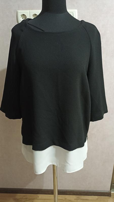 Нарядная, комбинированная блузка. Основная ткань достаточно плотная, совсем немножко растягивается. Рукава укороченные, реглан. Низ- белый шифон. Замеры : длина по спинке -66см, длина рукава от горловины -49см, пог-55см, низ-58см