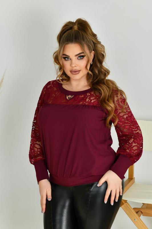 Блуза НОВИНКА💥💥💥 В НАЯВНОСТІ✅✅✅ Код 3625 Ткань: софт+гипюр Цвета: зеленый, марсала, ярко-синий, черный, белый, красный. Размеры: 52-54, 56-58, 60-62, 64-66. Длина блузы: 67, 68, 69, 70 см. Длина рукава: 61, 61, 62, 62 см. Обхват рукава: 40, 42, 44, 46 см. Замеры готового изделия: 52-54 ОГ 116 ОТ 102 56-58 ОГ 124 ОТ 110 60-62 ОГ 132 ОТ 118 64-66 ОГ 140 ОТ 126 Стильная нарядная блуза из софта с гипюром ( софт растяжимости не имеет). Вырез горловины круглый, декорирован оригинальной бижутерией. Рукав объемный, выполненный из гипюра, на манжете ( манжет не тянется). Блуза с напуском. Карман и застежек нет.