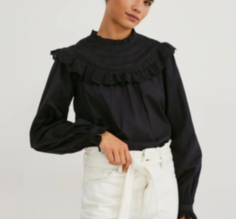 блуза с воланами , ткань прошва спереди и на рукавах , не тянется, пог 45 см, пот 45 см, плечи 40 см , длина рукава 65 см , длина 55 см. состояние идеальное, бирка с брендом срезана