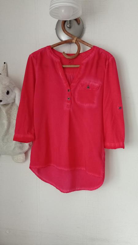 Превосходная тоненькая блуза, в жизни не такая яркая, более приятная, чем на фото. Сочетается две фактуры ткани, тоненький хлопок и трикотаж. Выглядит стильно. Перед коротший, все показала на фото. Брендированные пуговицы. Стан - безупречен.