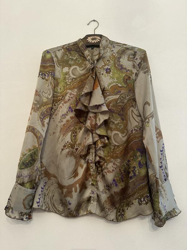 Невероятно красивая и качественная рубашка с воланом. Ткань полиэстер,на вид как дорогой атласный шелк. Цвета чуточку темнее, чем вышли на фото. Основной цвет оливковый. Без дефектов,все бирки есть. Длина от плеча 70 плечи 40 рукав с манжетами 65 пог 49-52 пот 46-48 по низу 47-57