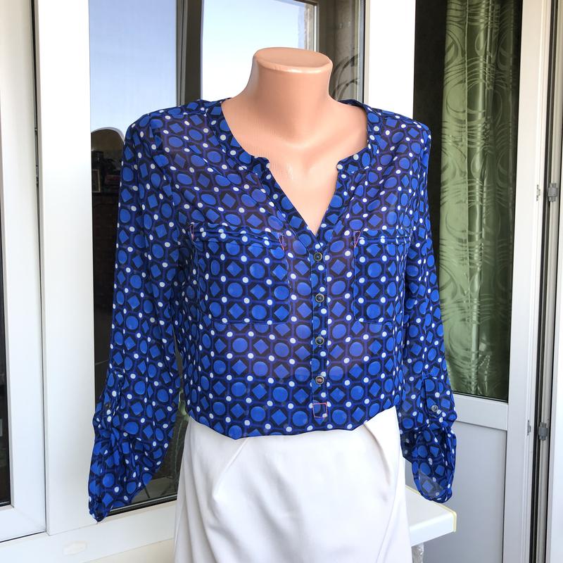 Чудова шифонова блуза насичено синього кольору з невираженими геометричними фігурами. Спереду є дві візуально привабливі кишеньки, V-подібний виріз і невеликі ґудзики. Рукав застібається на ¾. Можна носити під пояс. Матеріал легкий, трохи просвічується. Розмір 38. Фірма Street One.