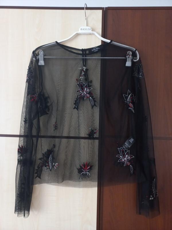 прозрачный лонгслив с расклешенными рукавами, отделанный вышивкой бисером и пайетками. Бренд Nikkie selected by Kate Moss