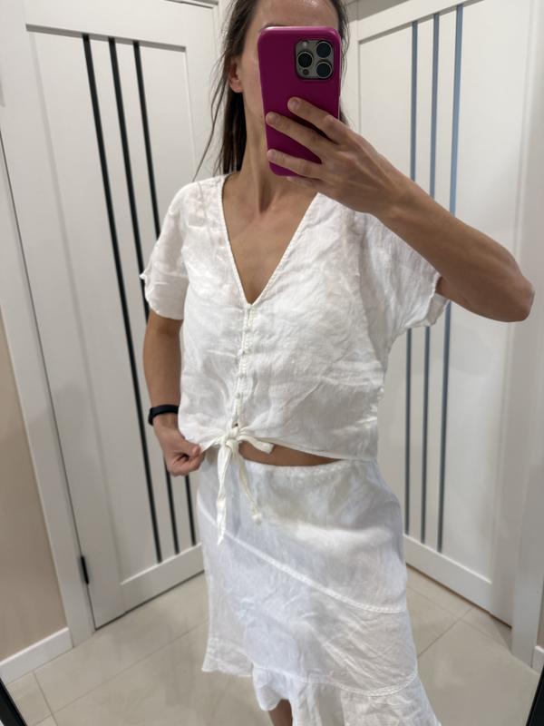 Блуша топ легкий H&M Розмір М Фото на мені з параметрами S-ки 100% льон Стан ідеальний, є запаска фурнітура Глибина вирізу 24,5 см Ширина у грудях 52 см Довжина від плеча 52 см