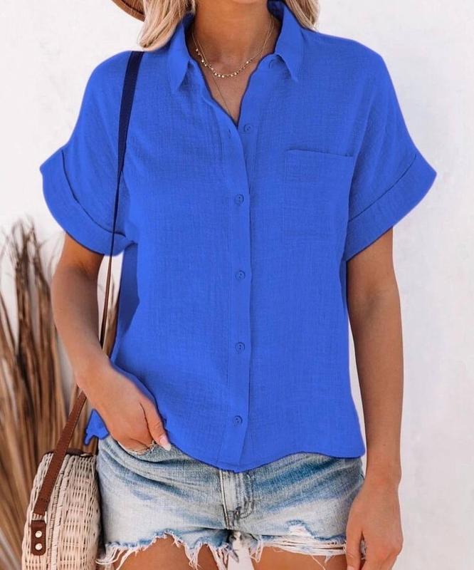 Блузка №621 Цена-450 грн Синий 42-44,46-48,50-52 Голубой 54-56 тканина льон Цвет - голубой, электрик Модная свободная рубашка на пуговицах с карманом на груди