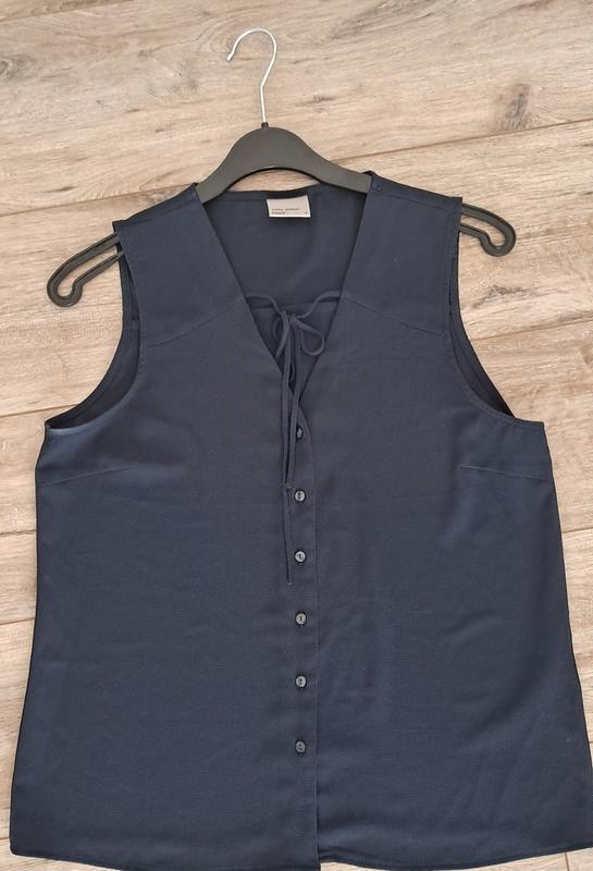 Красивая блуза без рукавов в благородном синем оттенке. Имеет интересную декоративную завязку в зоне декольте. Среди недостатков, несколько протертая ткань под правой ножной (последняя фото), которую при носке не заметно. Есть запасная пуговица. По фасону - свободная. На солнце немного просвечивается. ОГ - 50 см ОТ - 51 см.