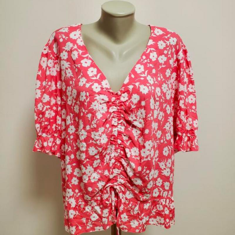 Ткань мягкая, легкая, нежная, не тянется. Талия сзади на резинке. ПОГ 64, ПОТ 64, ПОБ 60, плечи 47, рукав 35, ПО проймы 29, длина 60 см.