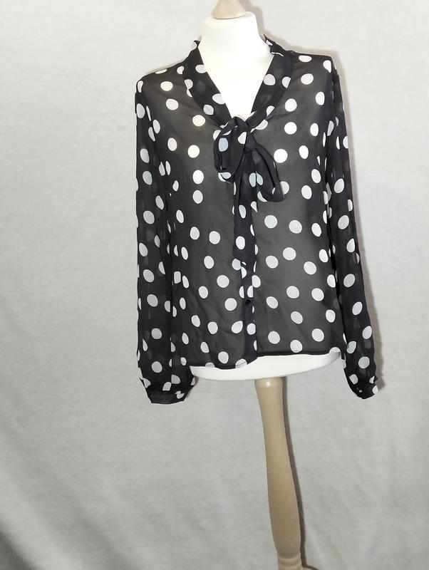 полуобъем груди -46.5 см длина изделия - 56.5 см длина рукава - 61 см полупрозрачная блуза черного цвета в белый горох, с V образным вырезом с завязкой и пуговицами, прямого кроя и утечками на пуговицах