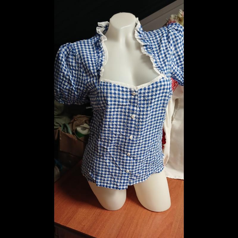 Гарнянка стильная блуза васильково - синего цвета в клетку, слегка приталенная, что добавляет женственности и чувственности, рукав короткий свободный. красиво подходит к джинсам или юбке создавать кантри стиль