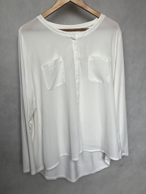 Жіноча біла кофта-блузка. Всі бірки зрізані. Орієнтовно розмір XL-XXL. Тканина на дотик віскоза. Мірки: Обхват грудей 64 см Ширина по низу 66 см Плече 12 см Від плеча до плеча 43 см Довжина рукава 64 см Довжина по спинці 79 см Довжина по переду 57 см