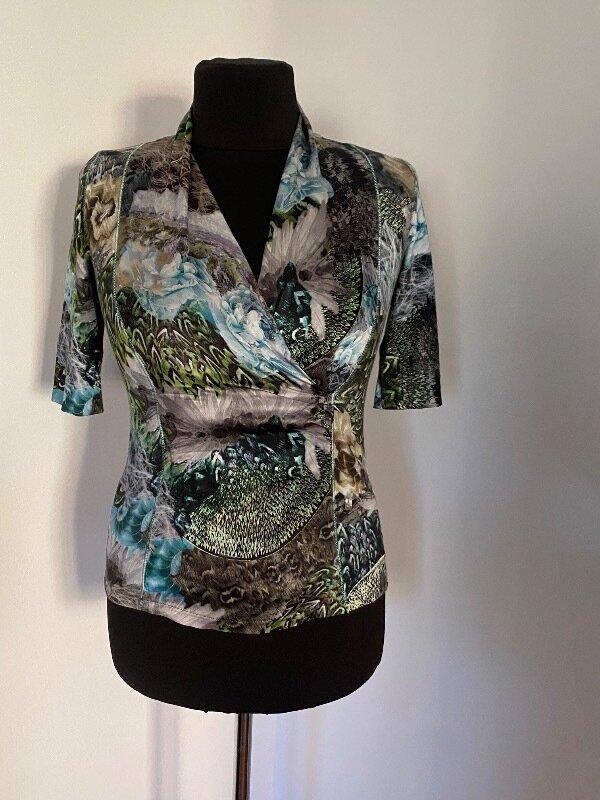Классная фирменная вещь, размер 2 указан. Перед шифоновый, остальные трикотаж в рубчик. Демонстрировано на манекене 52 размера. Длина - 59см, плечи- 36см, рукав от плеча - 32см, пог - 42см, тянется до 62см, пот- 37см, поб - 44см.