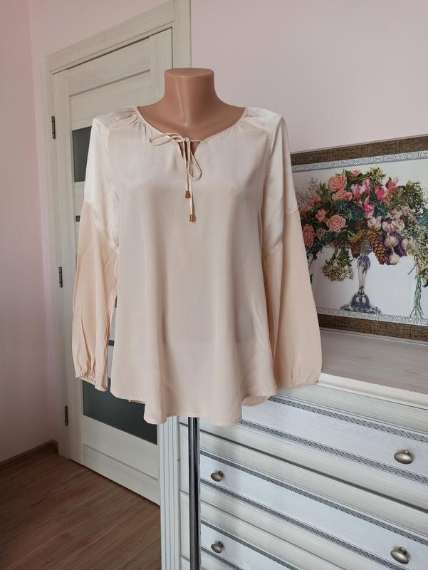 з натурального якісного ніжного шовку, в ідеальному стані, нюанс- останнє фото- забруднення на кінці рукава, вказаний розмір 34, по факту с/м довжина 65 рукав 63 пог 49