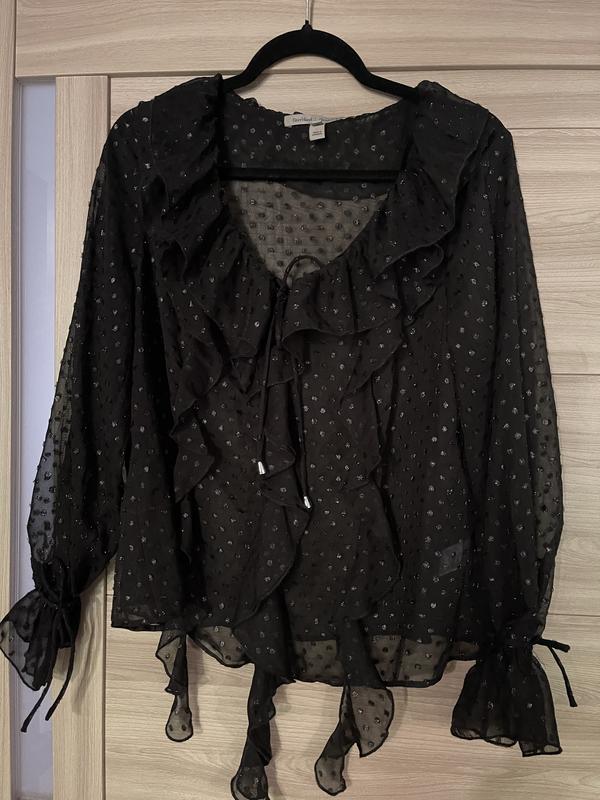 Блуза River island, прозора, розмір вказано 12(л), з трендовими рюшами, завʼязки на рукавах.на фото одягнено на хл, Заміри: Довжина по спинці 56см Плечі 45см Під рукавом 45см Рукав по верху від плеча 63 Рукав від горловини по верху75см