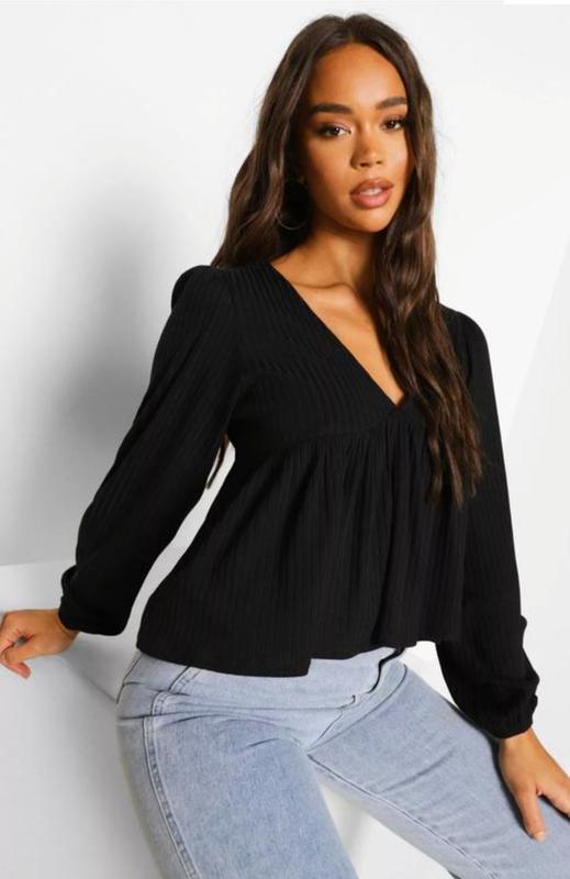 Женская блуза в рубчик черного цвета с длинным рукавом на резинке. Материал: 95% полиэстер, 5% эластан. На бирже указан размер 8. Замеры: пог 41см, длина 45см. рукав 60см. плечи 32см.