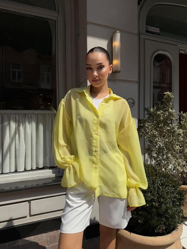 Женская прозрачная блузка, оверсайз Артикул 813 Тканина: шифон Размер: универсальный (S, М) Цвет - черный, шоколад, молочный, розовый, лимонный Цена: 500971