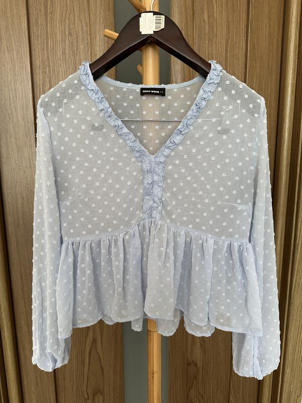 Блуза небесного цвета нежная, подойдет как под юбку так и под брюки или шорты, размер М.