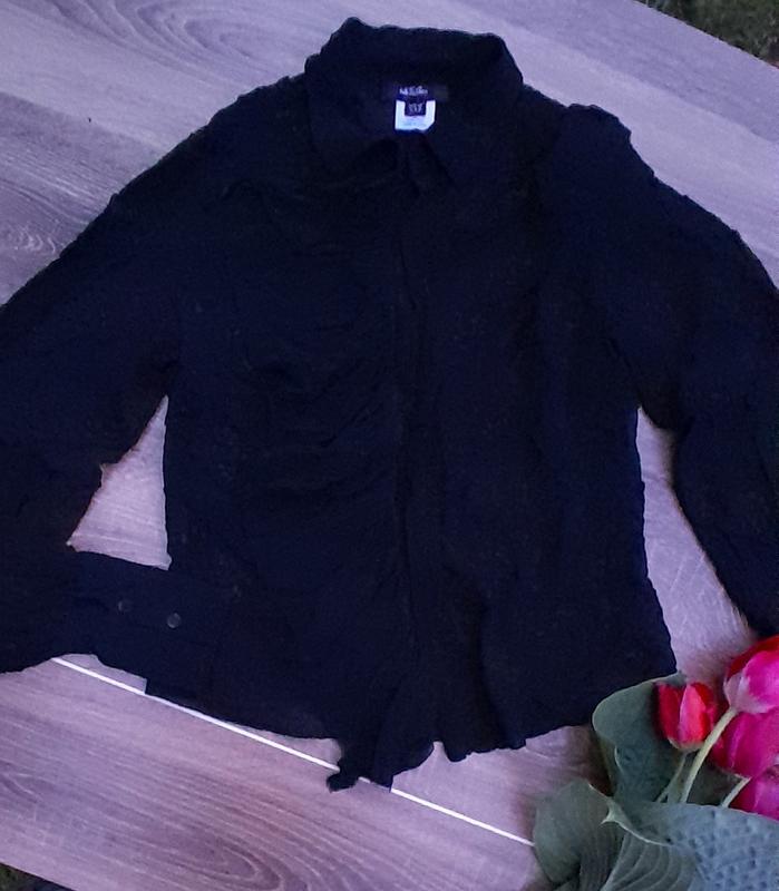 Изысканная женская блуза из натурального шелка в классическом черном цвете. Полностью выполнена из деликатного кружева, что добавляет образу легкости и женственности. Модель застегивается спереди на пуговицы, имеет легко расширенные рукава, которые сужаются книзу и завершаются элегантными манжетами с патентом, застегивающимися на две пуговицы. Идеальный выбор для особых событий, вечерних выходов или стильного офисного образа.