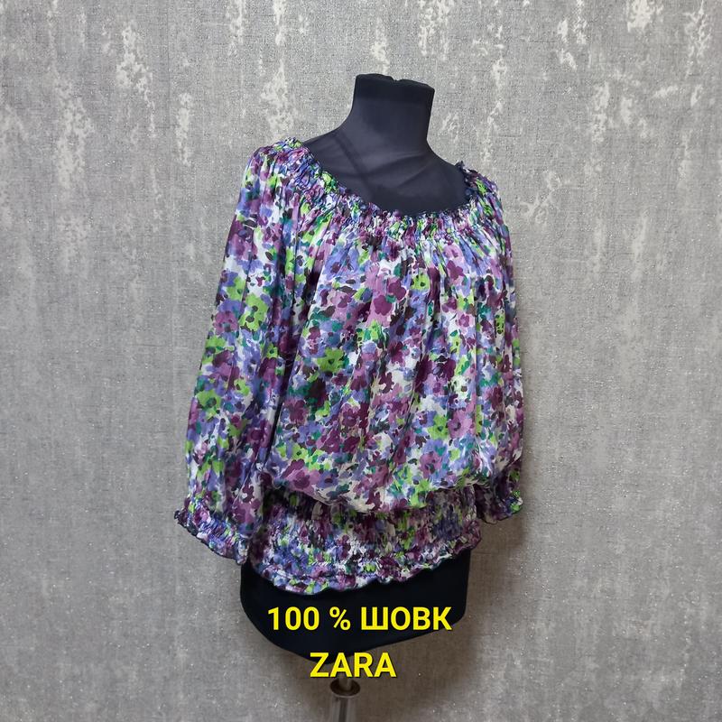 ШикаРНАЯ БЛУЗА С НАТУРАЛЬНОГО ШОВКУ ОТ БРЕНДУ ZARA🤩 ( производство Испания ) -100 % НАТУРАЛЬНЫЙ ШОВК (как невидимая вуаль.... -Очень красивое сочетание цвета с восхитительным цветочным принтом (подойдет абсолютно всым). -В районе драпировки эластичная комфортная резинка. -Блузу мягко носит с открытыми печами. -ЗМЕРЫ: размер указан S,а подойдет и на М. -ПОГ-70см. -ПОТ-72см. -Длина по спине-70см.,можно драпировать на меньшую длину. -Длина рукава от горловины- 51см.(теж драпир.) -Ширина резинки по низу полуобхват от 41см см. а тягнеться до 55 см.