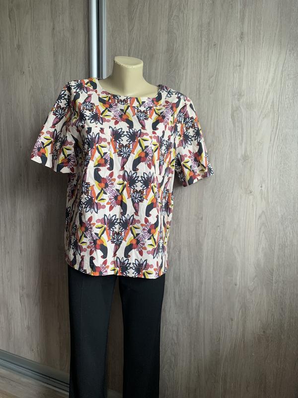 Чудова брендова бавовняна блузка з оригінальним принтом,дві кишенькі,ззаду на кнопках,по боках розрізи. Плечі 42см Напівоб’єм під руками 53см Низ 55см Довжина рукава 25см Довжина виробу 63см