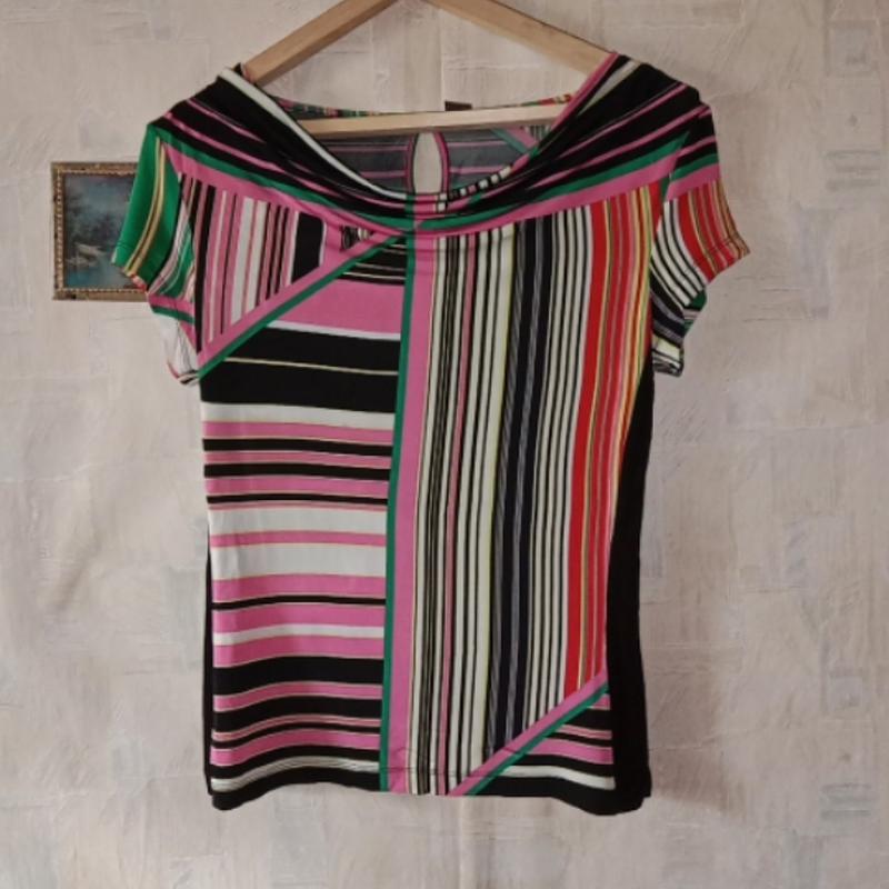 ПОГ 44+ ПОТ 40+ ПОБ 44+ Длина по низу 44+ Длина рукава 12 Длина изделия 60 Яркий блузон хорошо тянется за счет эластана. Приятная на ощупь ткань. Спереди на горловине- качели, сзади- слезка. Производство Греция