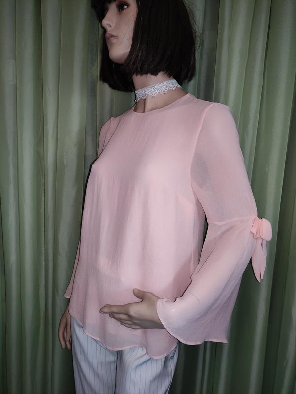 Блузка бренда "By very",919 8, пудрового цвета, полиэстер. Длина изделия 60 см, полукруг груди 46 см, ширина плеч 38 см, рукав 7/8 55 см, передняя часть изделия( полочка) на подкладке, по рукаву завязки на бант и рукав расширен к низу.