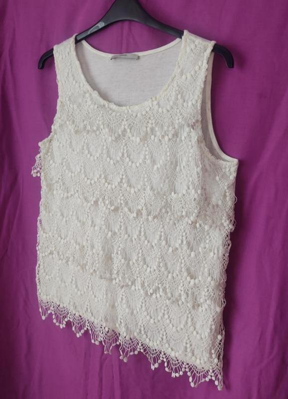 Летняя блуза без рукавов молочно-белого цвета, с вплетенной металлической тоненькой нитью; перед полностью украшен рядами из широких кружев, каждое из которых просрочено вверху; состав 99% натуральное волокно; известный британский бренд George. Замеры: проводились по спинке: длина -63; пог-вод 53: пот-от 54; обхват низа - от 130. Размер u9-16(50). Поскольку изделие трикотажное, наблюдается неплохая растяжка.