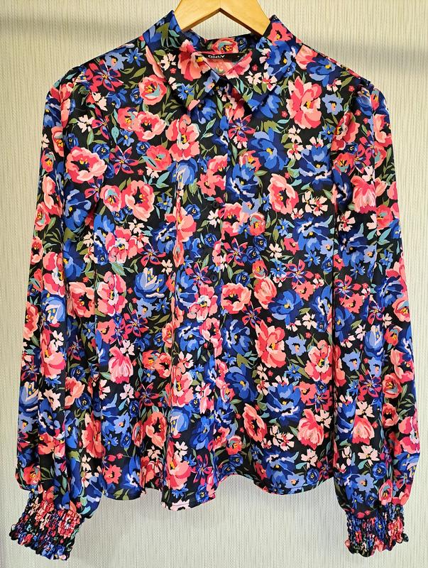 Блуза с ярким цветочным принтом. Манжеты рукавов на резинке. На бирке размер М. Плечі: 39 см. ПОГ: 49 см. Длина 61 см. Длина рукава от плеча: 66 см. Состав на наборе не указан, на ощупь синтетика/штучный шелк. По дополнительным замерам и фото обратитесь.