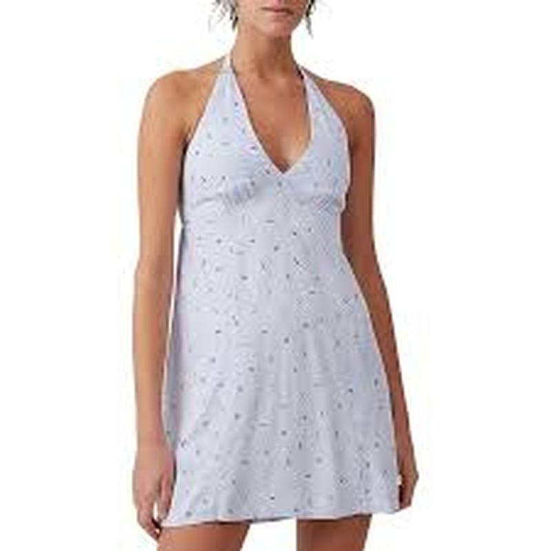 Желтое мини платье из коттона цветочный принт с завязкой на шее