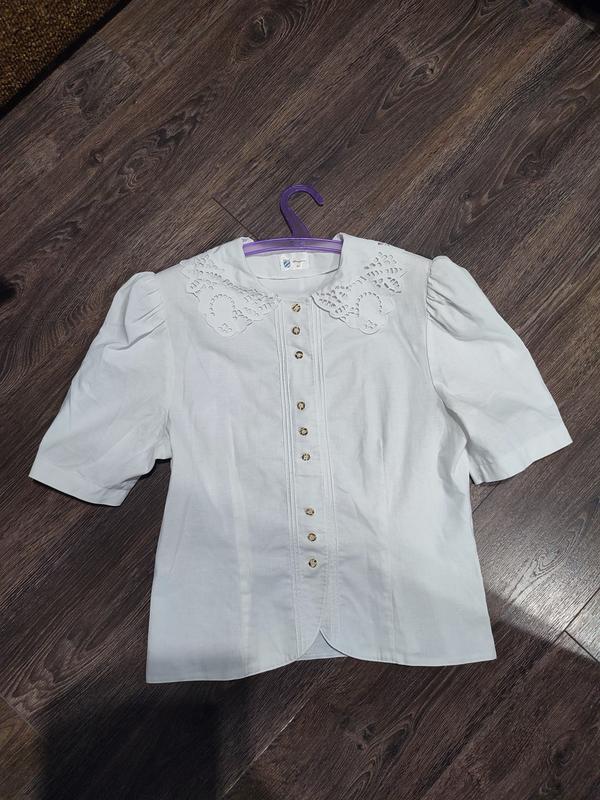 Винтажная баварская блузка Hargo, в идеальной сохранности, белушка, чистка, в отличном сохранности, камера затемнения, простая, лаконичная по крою, декорирована красивым воротничком, застегивается на пуговицы спереди, также пуговицы на рукавах, смотрится изысканно и в то же время стильно. 100% хлопок (по бирке), хорошей плотности полотна. Качество исполнения безупречно. Состояние отличное. Размер по бирке 40. ЗАМЕРЫ: плечи 39 см, расстояние от подмышки до подмышки 49 см, длина рукава 32 см, длина по спине 57 см. Фото на теле не имеет. Делайте выбор сознательно, возврат не имеет.