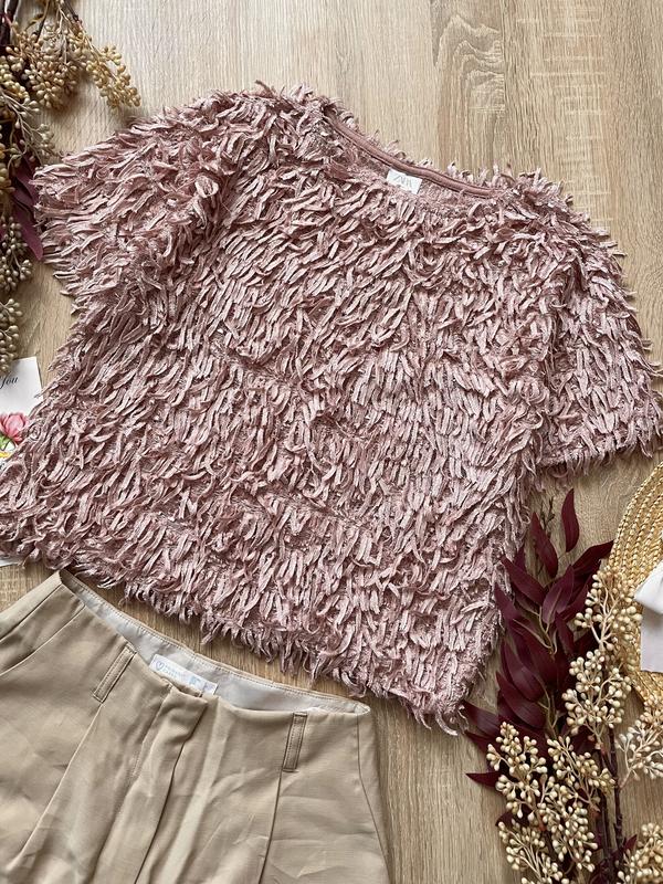 Блузка вкорочена прямого крою, від ZARA Повністю у велюровий «травці», в ніжному пір’ячку, виглядає нарядно Розмір дитячий, але в реалі чудово сяде на S Пог 46 Пот 42 Довжина 46 Рукав з плечем 28