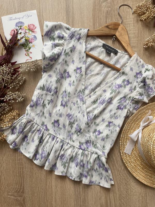 Мила блузка у квітковий принт, зі складом льону, легенька приємна до тіла Спереуд пошиття на запах, в талії ззаду резинка, внизу рюшка. Рукави з воланами Розмір S-M Пог 42 Пот 45 Довжина 48