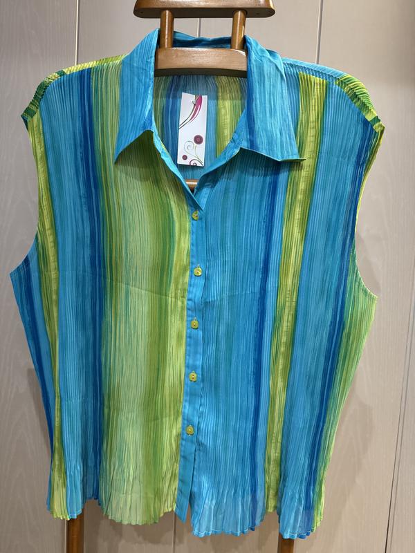 У наявності красива блузка фірми ESSENTIALE BY MILANO WOMAN. Розмір вказаний 3X, за замірами йде на 24/26. Склад: 100% поліестер, тканина-жатка дуже добре тягнеться. НОГ-68+щі добре тягнеться, довжина блузки — 70, плечі — 49, ширина низу —68 + що добре тягнеться.