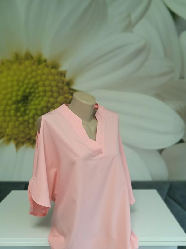 Классическая однотонная блузочка с коротким рукавом свет розового цвета. Легкая и удобная. Приятная к телу. Тонкая, но плотная ткань. Практически не тянется. Ложится свободно. Фасон прямой. Аккуратный вырез По плечам небольшие разрезы. Есть размеры. 58р на пог-62-64 56р на пог-60-62 54р на пог-58-60